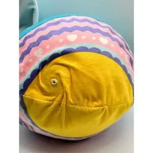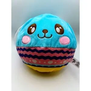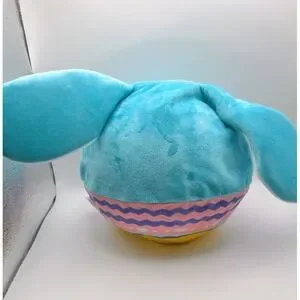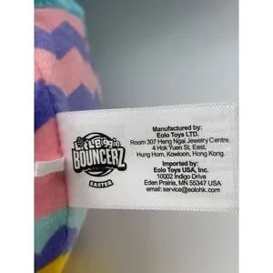 Lil' Biggie Bouncerz Easter plush toy features a vibrant blue bunny character with a colorful patterned base. This inflatable plush is designed for bouncing fun, constructed with a soft fabric exterior and an internal PVC balloon. The base displays a festive Easter-themed pattern with zig-zags and hearts in pink, purple, and white, sitting atop a bright yellow bottom. It includes a valve for inflation and is perfect for holiday gifting or sensory play.