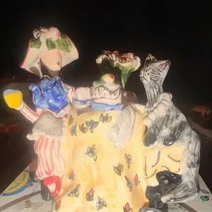 #1E/475 “Tea Time” by Heather Goldminc presented by Blue Sky Corp. figurine with a whimsical tea party scene. Features a lady, cat, and vibrant table setting. Perfect for adding character to any space.