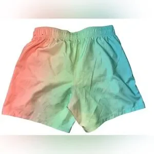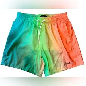 Stylish swim shorts with a green to orange gradient. Features drawstring waist and side pockets.