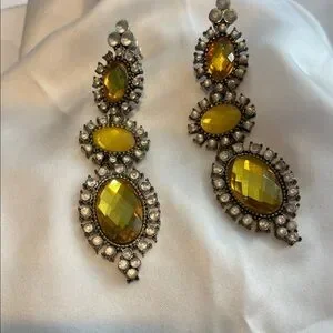 These stunning statement earrings feature a captivating gold hue, beautifully complemented by a silver setting. Perfect for adding a touch of elegance to any outfit.