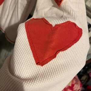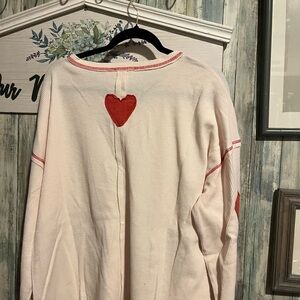 PATCH HEART WAFFLE PULLOVER - LARGE FRONT HEART PATCH - WAFFLE THERMAL FABRIC - RED PATCH HEARTS ON BOTH SLEEVES - V-STITCH DETAILS AT NECKLINE - PERFECT FOR VALENTINE'S OR ANYTIME YOU WANT TO FEEL THE LOVE