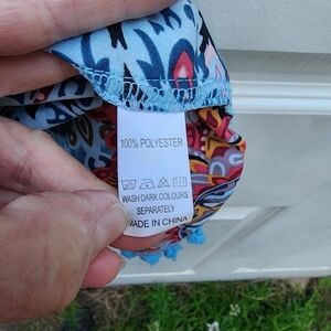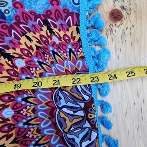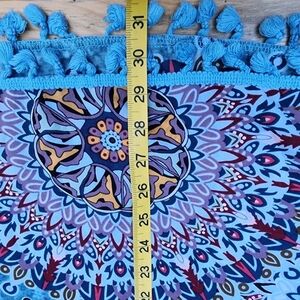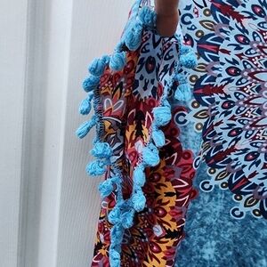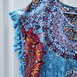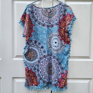 Lightweight and breezy, this Yincro women's beach cover-up features a stunning blue mandala pattern with vibrant red, orange, and white accents. Designed in a relaxed fit with playful blue tassel trim along the sleeves and hem. Perfect for throwing over a swimsuit at the beach or poolside. Tagged size Small, fits A-cup best. Gently used and in excellent condition.