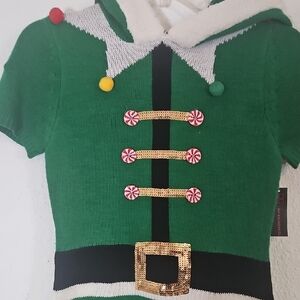 Ugly Christmas Adorable dress with green and white stripes and hood. Features playful button details and a belt design. Ideal for Holiday party wear.