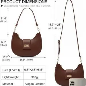 Brown vegan leather shoulder bag with multiple styles, 9.8x5.5x2.5 inches