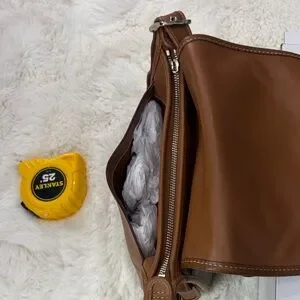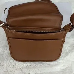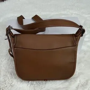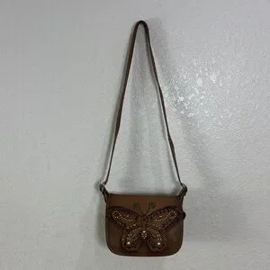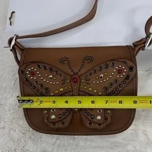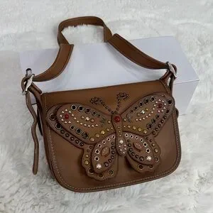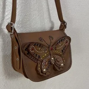 Brown leather crossbody bag with decorative butterfly stud detailing. Features multi-tone stud accents for a stylish, playful look. Adjustable strap for comfortable wear. Perfect for everyday use and adds a chic touch to casual outfits,Used perfect condition,please check the picture. It does not have the thing to open it and close it so you would have to push it open and to close it as well, check the pictures to see.
