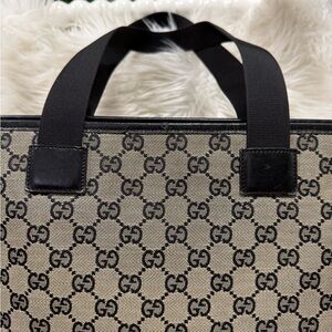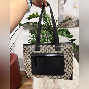 Authentic Gucci tote in signature GG beige canvas. Black leather front pocket with tassel zipper. Long black leather straps for shoulder carry. Timeless structured silhouette for daily use.