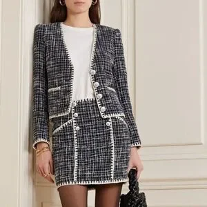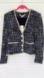 - Embossed front button closure, V neck, padded shoulders, front pockets, buttoned cuffs, tweed, lined