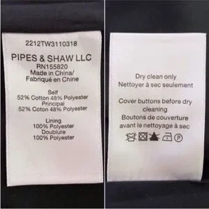 - Self 52% cotton 48% polyester. Lining 100% polyester. Dry clean