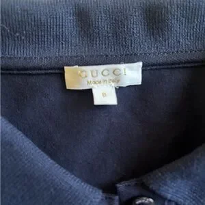 Elegant navy polo shirt by Gucci. Features classic collar and button details. Worn once, never washed. From a smoke and pet free home.