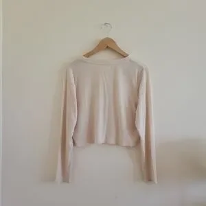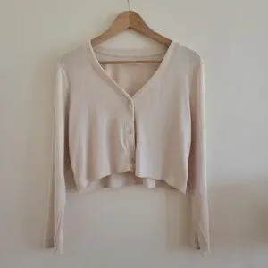 Stylish ribbed cardigan. Features a V-neck and button closure. Long sleeves with a cropped fit.