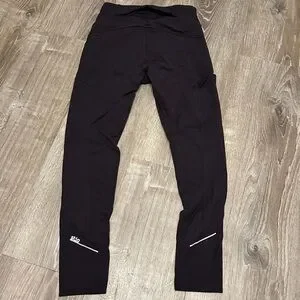 Sleek black leggings. Perfect for workouts or casual wear. Functional pockets on the side (one with zipper, one open pocket) and a pocket on the back side! Reflectors in the back bottom legs as well. Gently worn!