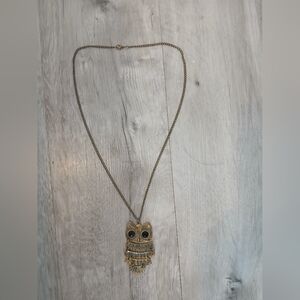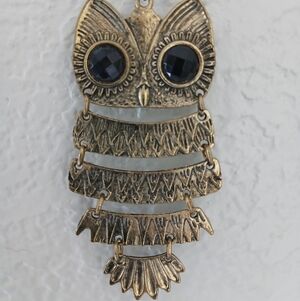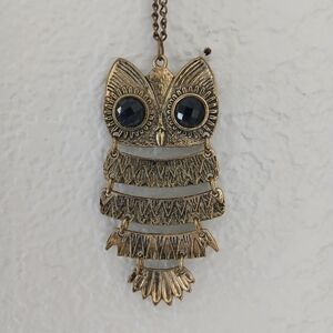 This vintage-style segmented owl pendant necklace is often described as an articulated gold-tone statement piece, similar to styles produced by brands like Cookie Lee or Goldette. Elegant owl pendant necklace featuring a gold finish with striking black accents. Perfect for adding a whimsical touch to any outfit.