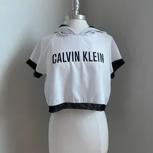 This awesome crop top hoodie is part of the Calvin Klein Swimwear line but can be worn as everyday wear with causal clothes like jeans shorts and converse or over workout gear or wear it out to part in it is so versatile! Super lightweight. Note the edges of the sleeves, the waistline and the interior of the hood are all trimmed in mesh, adds that lil something extra! ๐