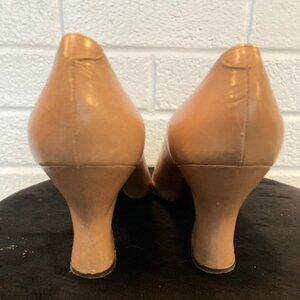 A piece of Canadian fashion history. These stunning tan leather heels were originally purchased from the legendary David’s (of Toronto) boutique at Bay and Bloor by my grandmother decades ago. Handmade in Greece with exquisite craftsmanship, they have been carefully kept in storage for over 30 years. In a supple leather they feature lovely scalloped detailing and a unique sculpted heel.
