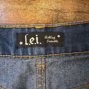 Casual denim mini skirt by lei. Front pockets and belt loops. Subtle faded detailing for a worn-in look. Straight hem and simple silhouette. Easy to style for everyday outfits.