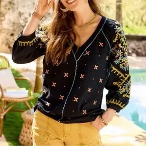 Sundance Cotton Embroidered Blouse Puff Sleeve V Neck Black Size Large BNWT