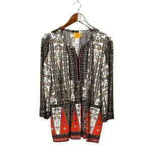 This tunic top features a bold geometric design with a flattering 3/4 sleeve. The lightweight fabric blend offers comfort and a stylish boho look.