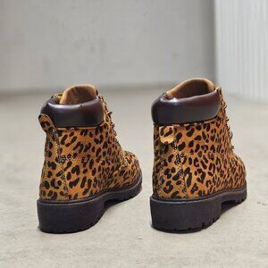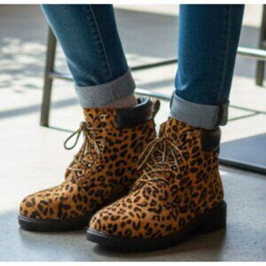 Stylish and functional ankle boots featuring a bold leopard print design, durable lace-up closure, and padded collar for enhanced comfort and support.