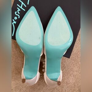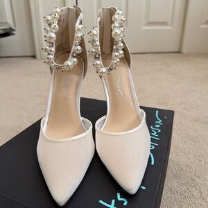 Betsey Johnson. Style: SB-Ellah pumps. Ivory satin. Mesh toe. Pearl ankle strap. 4” heel height. Size 8.5. Unworn other than to try on.