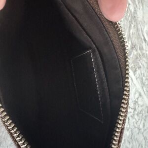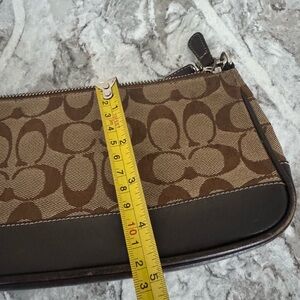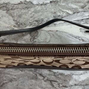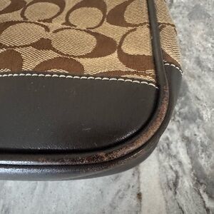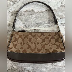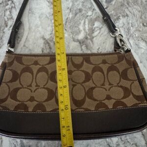 Classic and timeless Coach signature mini shoulder bag featuring the iconic brown C monogram jacquard canvas with dark brown leather trim. This compact zip-top style is perfect for everyday essentials and adds a classic designer touch to any outfit.