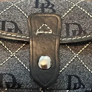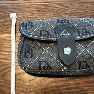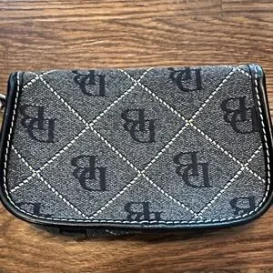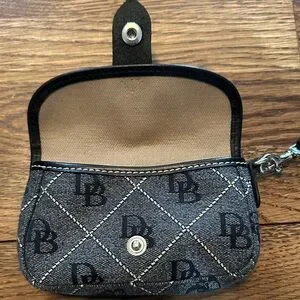 Dooney & Bourke wristlet with quilted logo pattern. Front flap with snap closure. Compact and stylish for essentials. Leather trim and stitching details. Versatile for day or night.