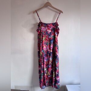 Sleeveless midi dress with a front button closure. Fitted at the waist and falls to a straight midi hem. Bold floral print in contrasting hues. Adjustable straps. Side pockets. NWT. Size 14. 100% viscose.