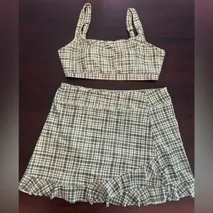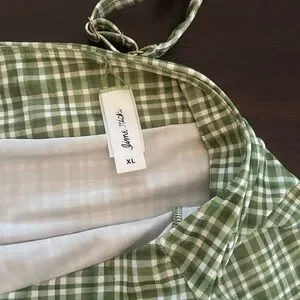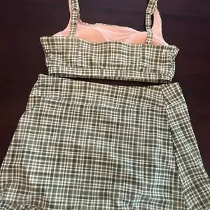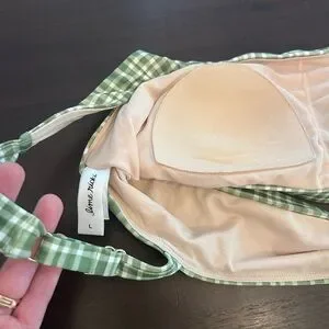 L top XL bottom (true to size). Super cute green gingham print swim suit that provides maximum coverage on bottom with a playful ruffle. Adjustable straps and lightly lined cups on top.