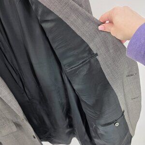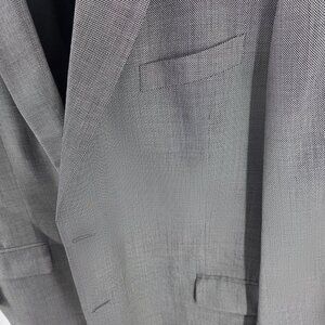 Joseph Abboud blazer in a classic black and white micro-texture weave with 100% wool construction. Two-button front, notched lapels, flap pockets, and a fully lined interior give this jacket a polished, structured feel. A versatile, timeless sport coat suited for business casual, formal occasions, or smart everyday wear. Pre-owned with a small spot noted — please see photos.