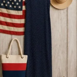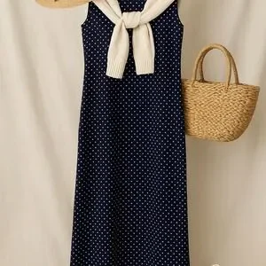 Elevate your wardrobe with this timeless navy blue midi dress by Jamie Brooke. The classic white polka dot print, scoop neckline, and side slits offer an effortlessly flattering silhouette. Made from 100% rayon, it's lightweight, breathable, and drapes beautifully.