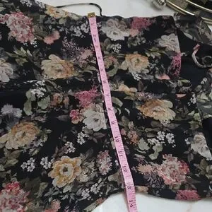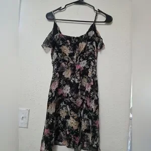 Lightweight slip dress with a ruffle V-neck and thin adjustable straps. Soft floral print on a black base. Flowy A-line skirt with feminine movement. Easy to dress up or down.