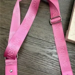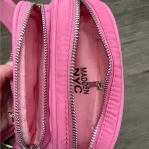 Madden NYC pink crossbody designed for everyday ease. Bright pink color with a wide adjustable strap for comfortable wear. Includes a small detachable pouch for cards or earbuds. Smooth finish with subtle Madden NYC logo for a modern look.