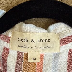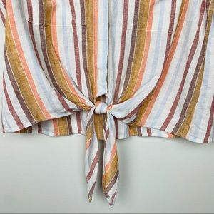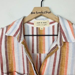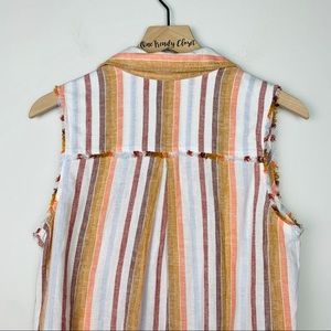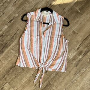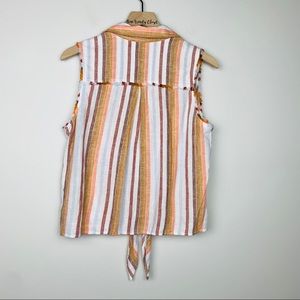 Sleeveless blouse with multicolor stripes. Features a front tie detail. Lightweight and stylish. Cloth & Stone. Freight edges around arm openings, two front patch pockets, button up front with open collar, has a gauze like texture,. Smoke free seller.