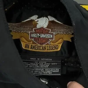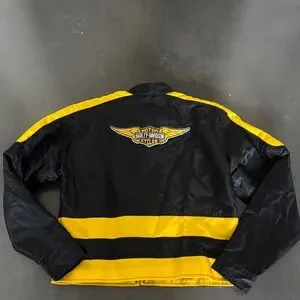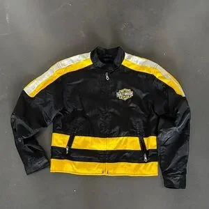 Lightweight Harley-Davidson windbreaker with bold yellow stripes. Zip-front closure and zippered pockets. Embroidered Harley-Davidson logo on chest. Sporty design for riding or casual wear.