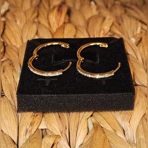 Shimmering 18k Yellow Gold Plated 25mm Hoop Earrings with Swarovski Crystals designed to add elegant sparkle to any outfit. Comfortable, secure fit for all-day wear.