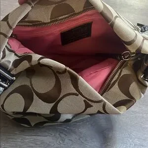 Tan/brown authentic signature coach shoulder bag with hot pink interior