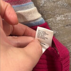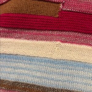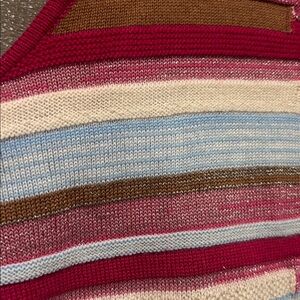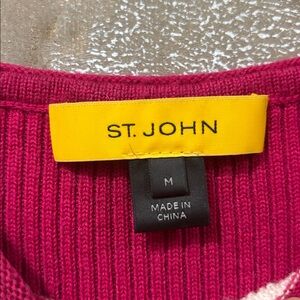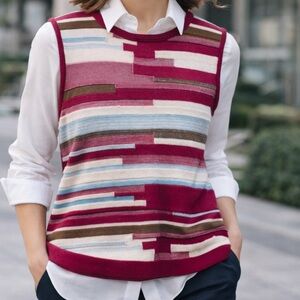 Beautiful St. John knit wool sweater vest featuring a rich magenta tone with multicolor horizontal striping and subtle metallic shimmer throughout the knit. This piece has the timeless, polished look St. John is known for and layers effortlessly for a sophisticated style.