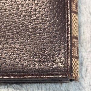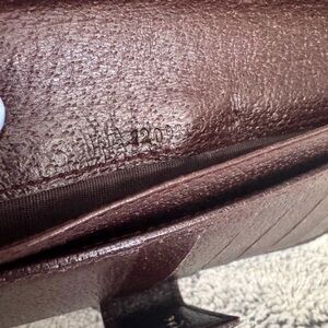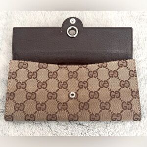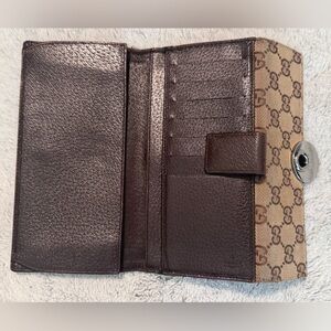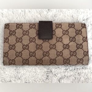 •Authentic long wallet made of brown canvas with leather trim and interior.