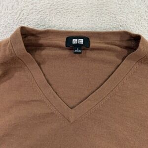 Uniqlo Mens Large V-Neck Sweater Mens Brown 100% Wool 460935 Fine Knit Classic
