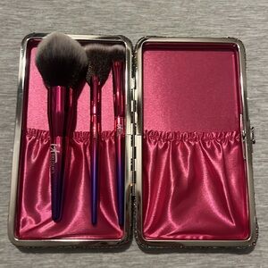 Limited Edition IT Cosmetics Rockstar brush set. Includes 3 full-size brushes: Powder, Highlight, and Shadow. Comes with a glitter clutch that doubles as a stylish night-out bag. Clutch has snap closure, satin interior, and elastic pockets for secure storage.