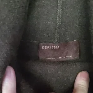 Elegant poncho sweater by Kerisma. Features a stylish charcoal olive green color. Perfect for layering.