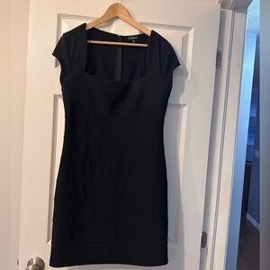 Sleek black sheath dress with cap sleeves. Structured square neckline. Streamlined, body-skimming silhouette. Versatile piece for evening or office wear.