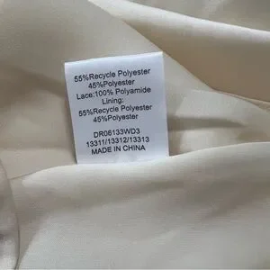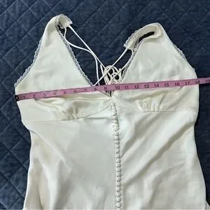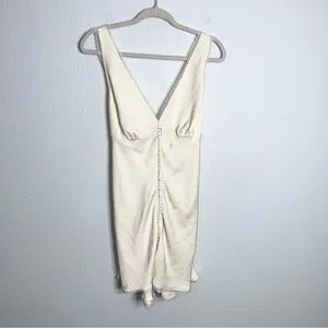 Elegant cream mini dress. Features a deep V-neckline. Delicate lace trim. Perfect for a night out.