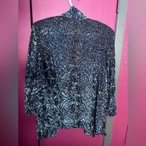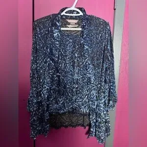 Stylish blouse with intricate blue and black design. Ideal for versatile wear.