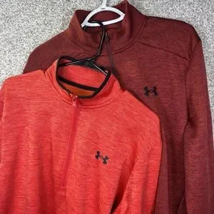 Pre-owned Under Armour fleece sweatshirts with light overall wear from prior use and laundering. Polyester fabric shows mild wash wear and wrinkling from storage, with fabric, seams, zipper, and logo remaining clean and intact and no stains, holes, or damage. Interior fleece, cuffs, and hem are in good shape without pilling or fraying, and no original retail tags or packaging are included. Only the darker red sweatshirt shown is included; the lighter red garment in some photos is not part of this listing.