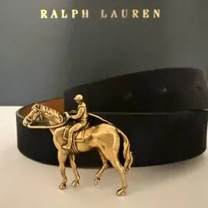 Polo Ralph Lauren Men’s Navy Suede Equestrian Belt – Gold Horse Buckle – Made In Italy – Size 38