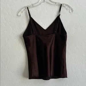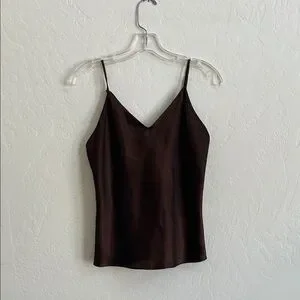 Adjustable brown satin cami with a flattering V-neck and thin adjustable straps. Lightweight and smooth fabric for a polished everyday or evening look. Easy to style with jeans, skirts, or layered under blazers. The brand tag has been cut off because it was very itchy, but otherwise in great condition