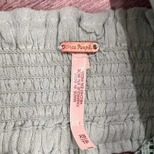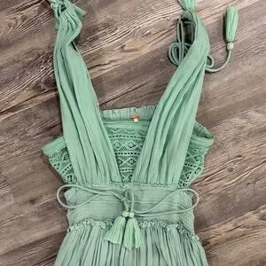 Flowy free-spirited maxi dress by Free People. Lightweight fabric with ruffle and crochet details. Adjustable tie straps and empire waist. Soft, breezy silhouette for warm days.