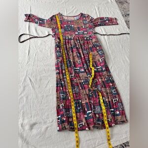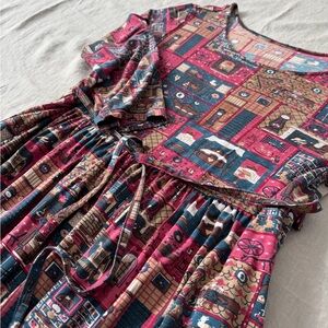 Flowing maxi dress with a rich patchwork print. Features clocks, bedrooms, vintage furniture. Very bookish library feel! Long/ 3/4 sleeves and a gentle scoop neckline. ✨ pockets ✨ Gathered waist with removable waist straps to tie in the front or behind as shown.
