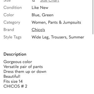 • Size: Chico's Size 2 (Equivalent to a standard US Women's Size 12 / Large)