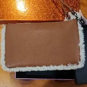 Elegant Coach wristlet in tan leather. Features white shearling trim. Ideal for versatile use.